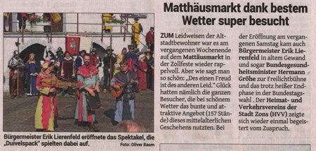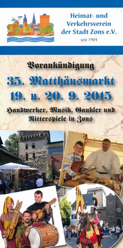Handwerker und Kaufleute beim bunten Markttreiben, stilechte Reiter- und Bogenschützenturniere mit stolzen Rittern und Edelfrauen, lustige Spielleute mit allerlei Instrumentarium und historische Fanfarenklänge – am 21. Und 22. September lebte in der Zollfeste wieder das Mittelalter auf. Bereits zum 33. Mal lud der Heimat- und Verkehrsverein (HVV) der Stadt Zons zum MATTHÄUSMARKT in die historische Altstadt ein. In der Tradition des historisch verbrieften Marktrechtes hat der HVV Zons den Matthäusmarkt vor 33 Jahren als Handwerker- und Kunsthandwerkermarkt wiederbelebt. Auch in diesem Jahr waren wieder rund 150 Handwerker und Händler in der Altstadt, den Innenhöfen des Kreiskulturzentrums und im Zwinger vor der Freilichtbühne vertreten.