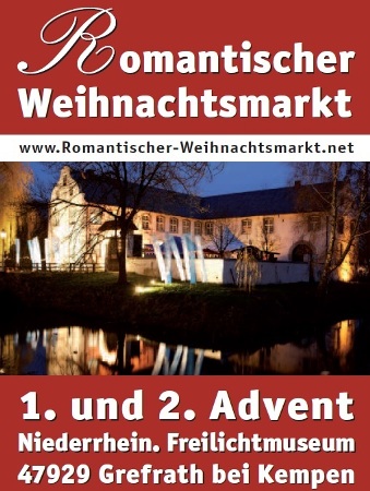Beim „Romantischen Weihnachtsmarkt“ im Niederrheinischen Freilichtmuseum am 2. Adventswochenende bieten ca. 100 der besten Designer, Künstler und Kunsthandwerker in den Fachwerkhöfen und rund um das Wasserschloss Dorenburg ihre selbst gefertigten Kreationen an.Knisternde Feuerkörbe, zahlreiche Fackeln und mehrere Tausend Lichtquellen tauchen das Gelände in eine traumhafte Atmosphäre. Mit wechselnden Programmpunkten und kulinarischen Köstlichkeiten.