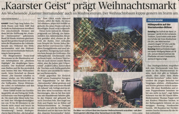 Auf den großen Weihnachtsbaum in der Mitte des Geschehens muß in diesem Jahr leider verzichtet werden - der Sturm am Freitag knickte ihn bei Windstärke bis 90 um.