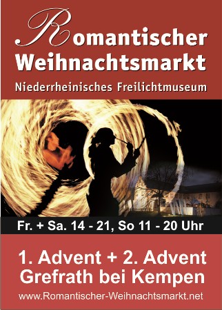 Beim „Romantischen Weihnachtsmarkt“ im Niederrheinischen Freilichtmuseum am 2. Adventswochenende bieten ca. 100 der besten Designer, Künstler und Kunsthandwerker in den Fachwerkhöfen und rund um das Wasserschloss Dorenburg ihre selbst gefertigten Kreationen an.Knisternde Feuerkörbe, zahlreiche Fackeln und mehrere Tausend Lichtquellen tauchen das Gelände in eine traumhafte Atmosphäre. Mit wechselnden Programmpunkten und kulinarischen Köstlichkeiten.